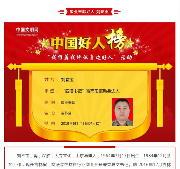 中 国 好 人 由中央文明办举办的“推荐、评议身边好人”活动,经吉林省委宣传部推荐选送的我商会会长、党总支书记刘春宝,在众多的参评选手中脱颖而出,光荣当选中国好人。刘春宝会长的模范引领,奉献社会的先进事迹在行业内引起了强烈反响。